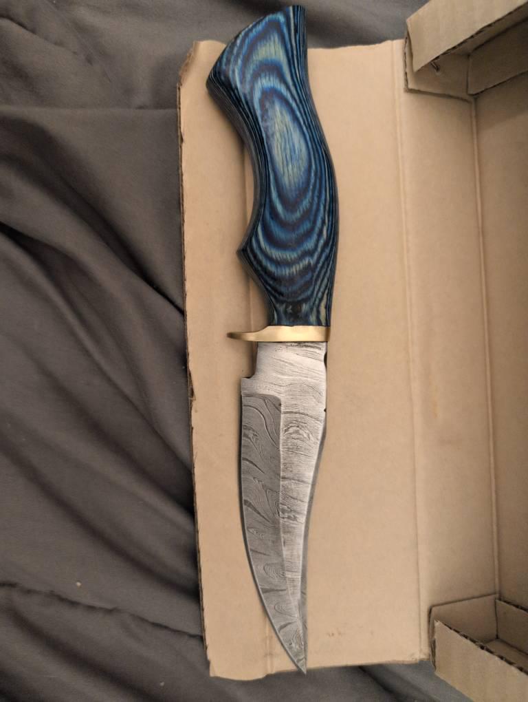 The knife is beautiful exactly what I expected and more. The blade is sharp and oiled. The Blue matches the description and the pattern on the blade is beautiful . The leather quality and design is perfect. It will need to be broken in, but all leather does. Was shipped fast and I received it in a couple of days.