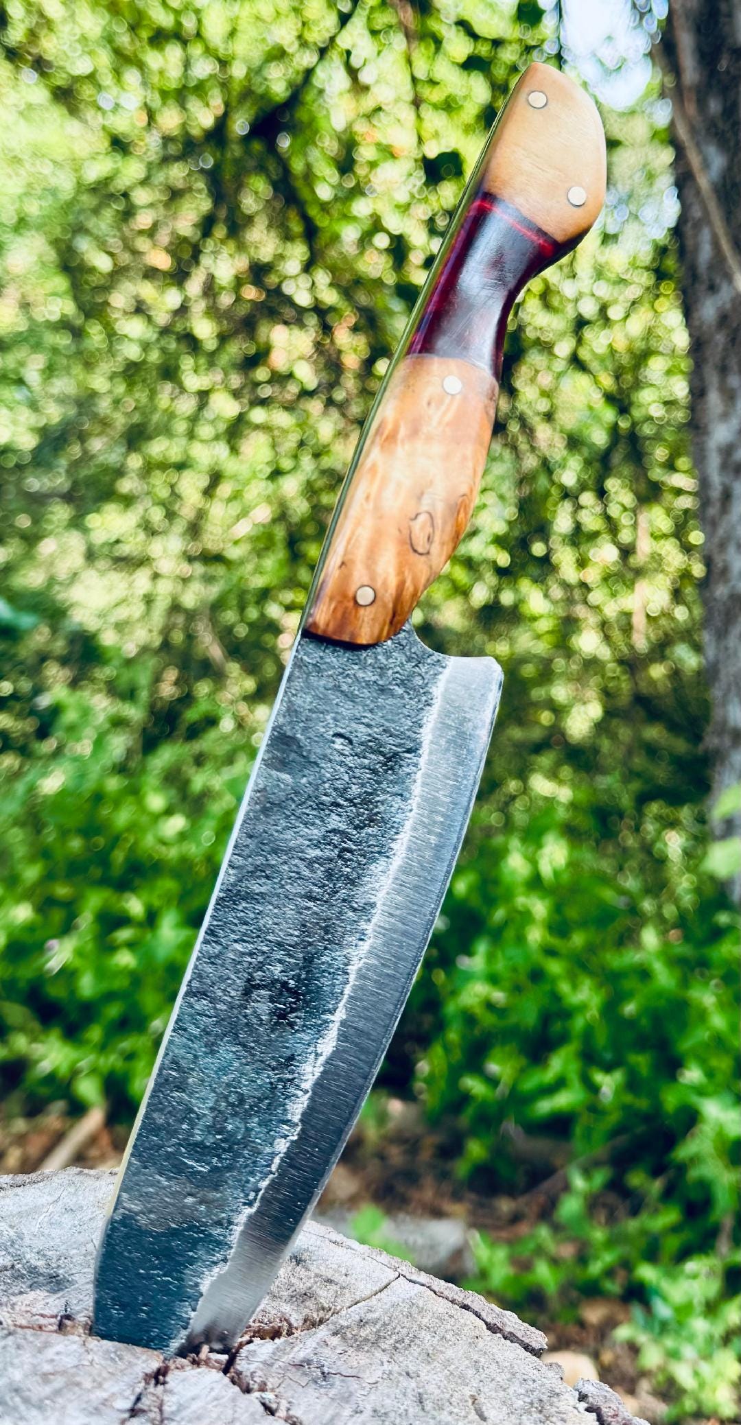 . Today, we layer & hand forge two different steels 15n20 & 1095. It is then dipped in Ferric Chloride creating a distinct reaction with the metals producing a Damascus like pattern.